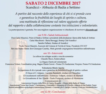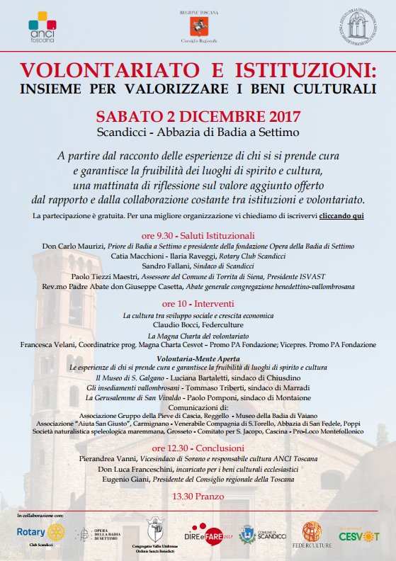 Sabato 2 dicembre, nella splendida cornice dell'Abbazia di Badia a Settimo di Scandicci, a partire dal racconto delle esperienze di chi si si prende cura e garantisce la fruibilità dei luoghi di spirito e cultura, abbiamo dedicato una mattinata di riflessione sul valore aggiunto offerto dal rapporto e dalla collaborazione costante tra istituzioni e volontariato. L'iniziativa è stata organizzata da Anci Toscana, Consiglio Regionale della Toscana e Istituto per la valorizzazione delle Abbazie Storiche della Toscana