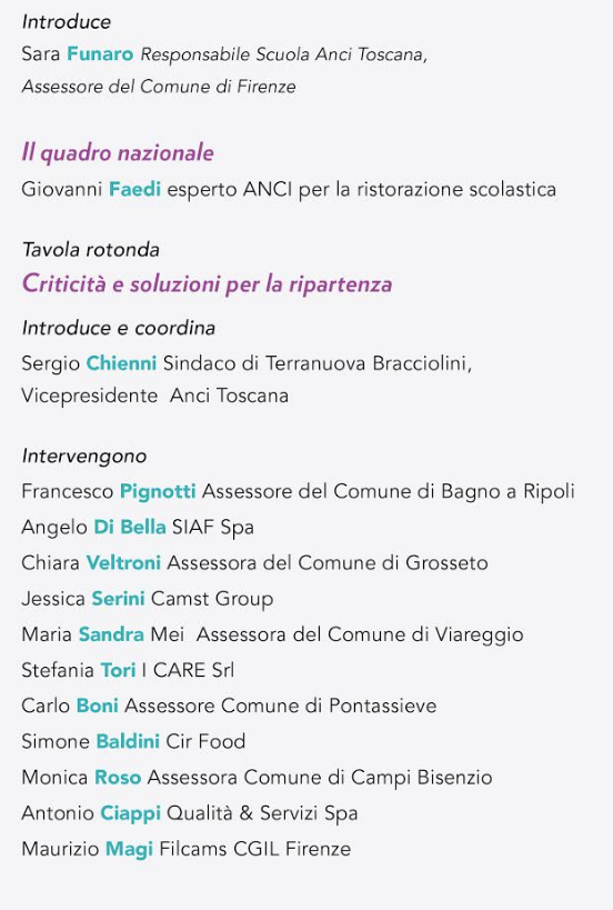 Introduce i lavori Sara Funaro Responsabile Scuola Anci Toscana e Assessore del Comune di Firenze. Si apre quindi il focus sul quadro nazionale, con: Giovanni Faedi esperto ANCI per la ristorazione scolastica, si apre quindi la Tavola rotonda "Criticità e soluzioni per la ripartenza" introdotta e coordinata da Sergio Chienni Sindaco di Terranuova Bracciolini, Vicepresidente Anci Toscana, alla quale interverranno Francesco Pignotti Assessore del Comune di Bagno a Ripoli, Angelo Di Bella SIAF Spa, Chiara Veltroni Assessora del Comune di Grosseto, Jessica Serini Camst Group, Maria Sandra Mei Assessora del Comune di Viareggio, Stefania Tori I CARE Srl, Carlo Boni Assessore Comune di Pontassieve, Simone Baldini Cir Food, Monica Roso Assessora Comune di Campi Bisenzio, Antonio Ciappi Qualità & Servizi Spa, Maurizio Magi Filcams CGIL Firenze. >> ISCRIVITI